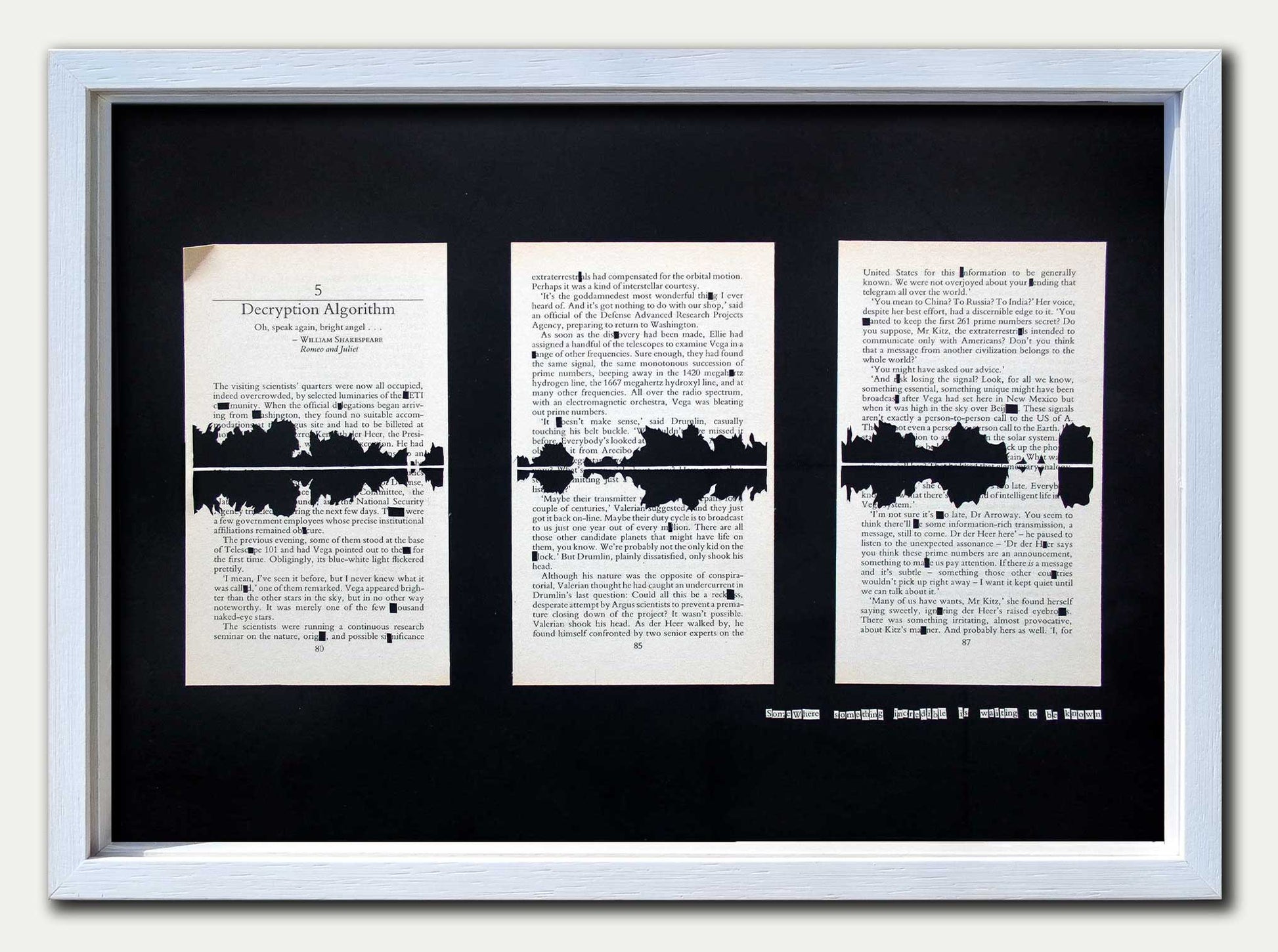 Contact by Carl Sagan, hand cut artwork. Inspired by the signal received from Vega. Hand cut from 3 pages of Carl Sagan's novel. I have cut out letters and used them in the order they appear on the pages to create Sagan's line: