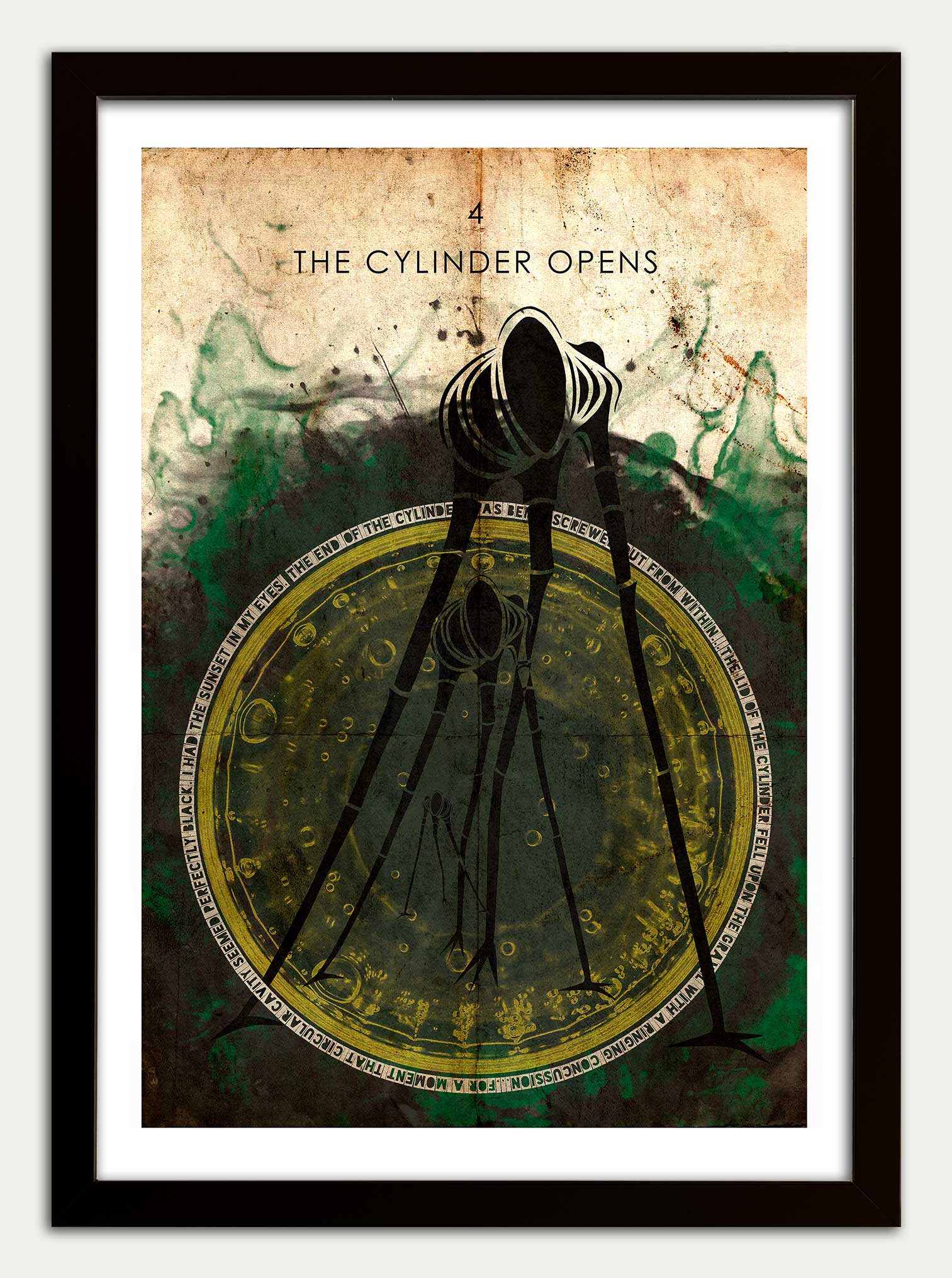 War of the Worlds art print featuring the title to chapter 4: "The Cylinder Opens". Biomechanical Tripods march from within.
