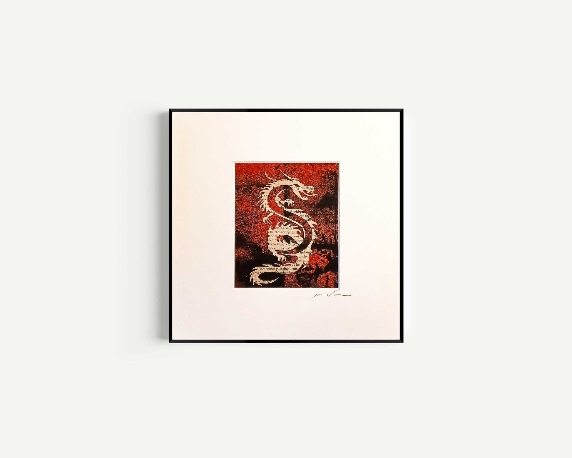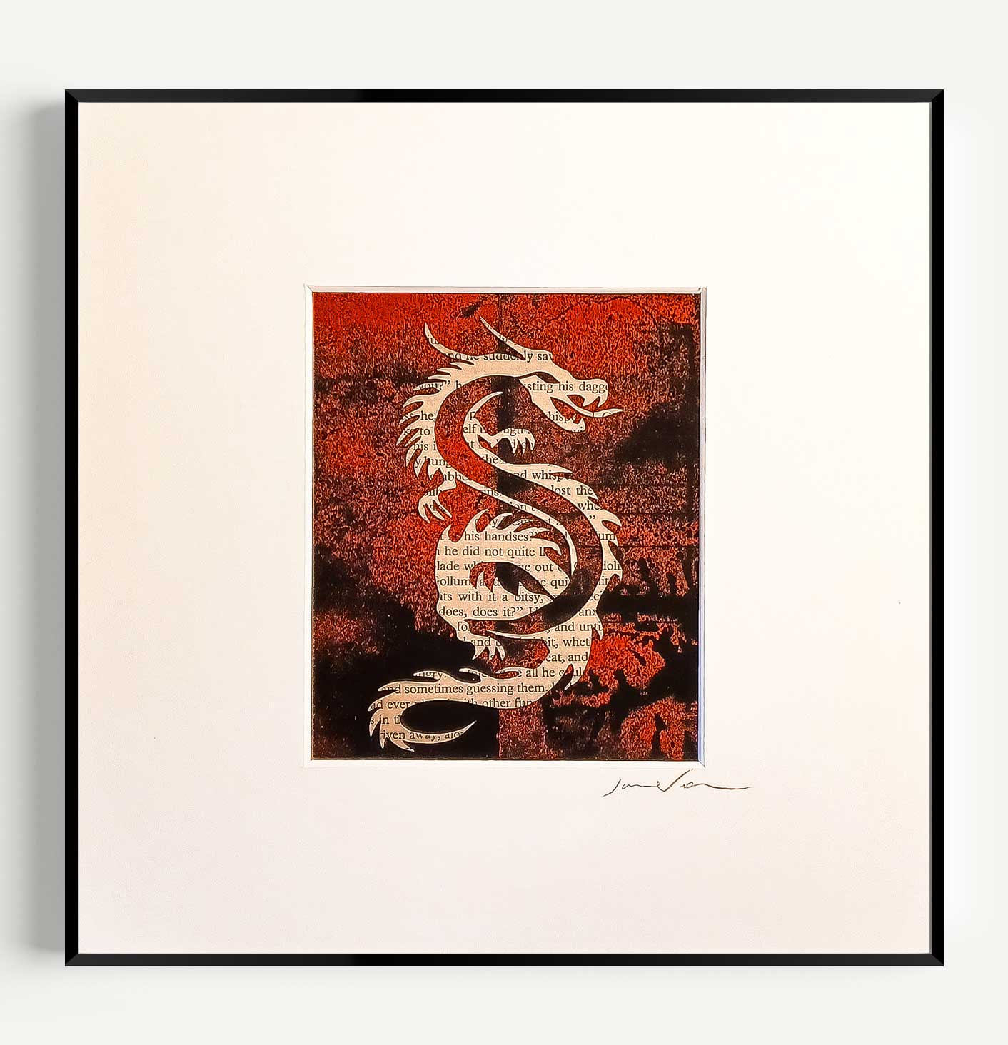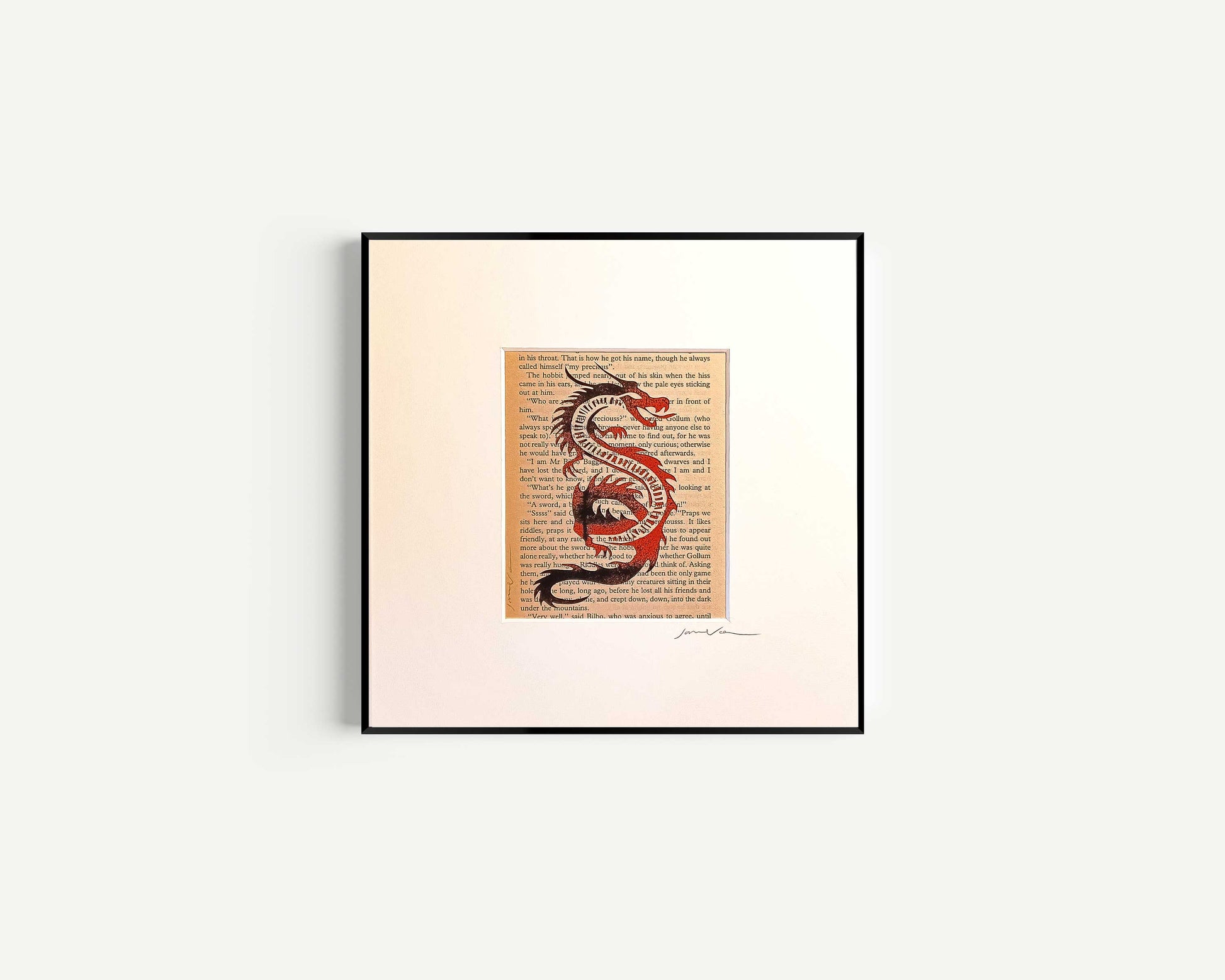 This is page 70 from JRR Tolkien's The Hobbit. Both artworks are handcut from the same page and are mounted on an red grunge background. Part of my Little Papercuts collection