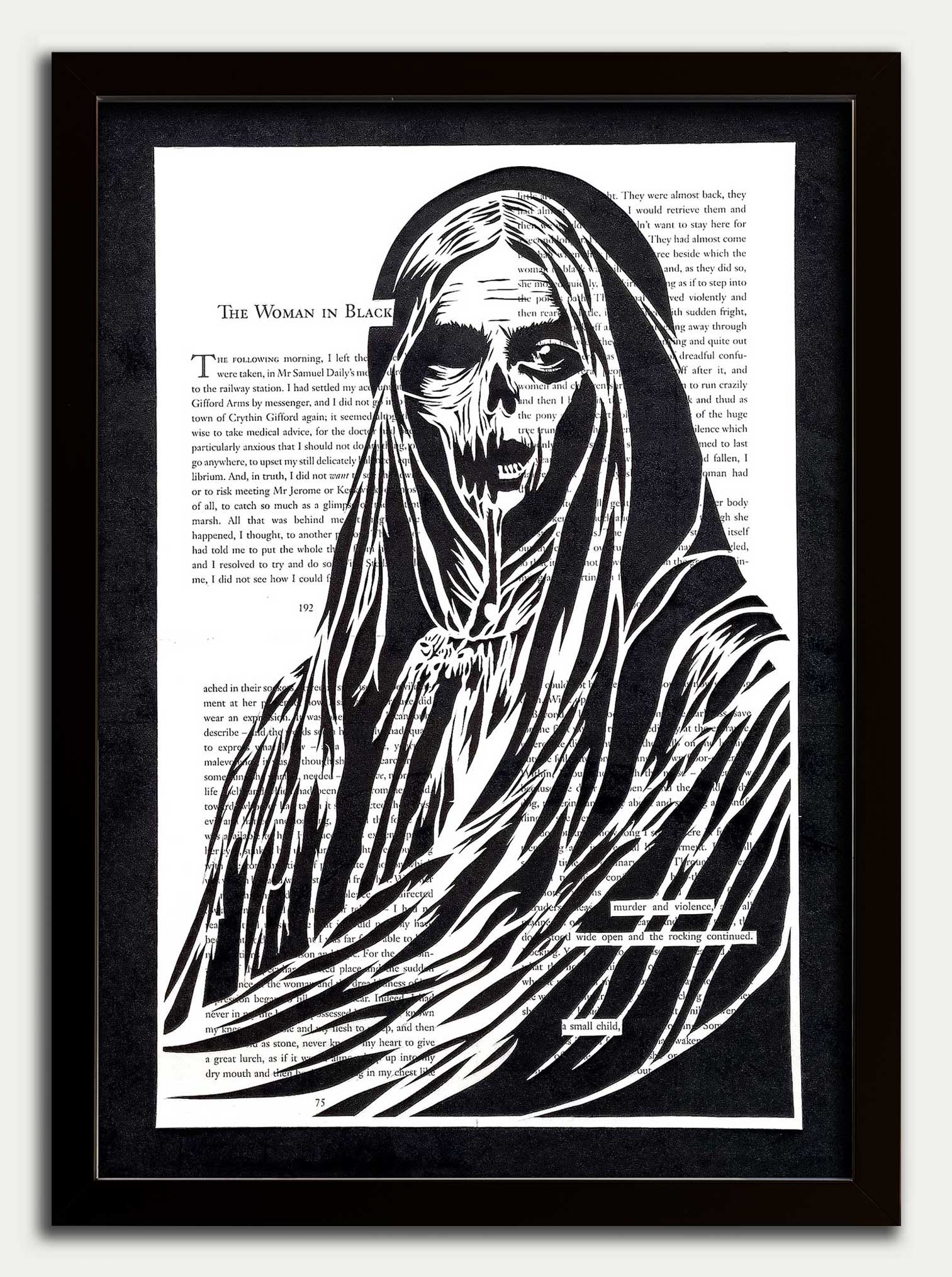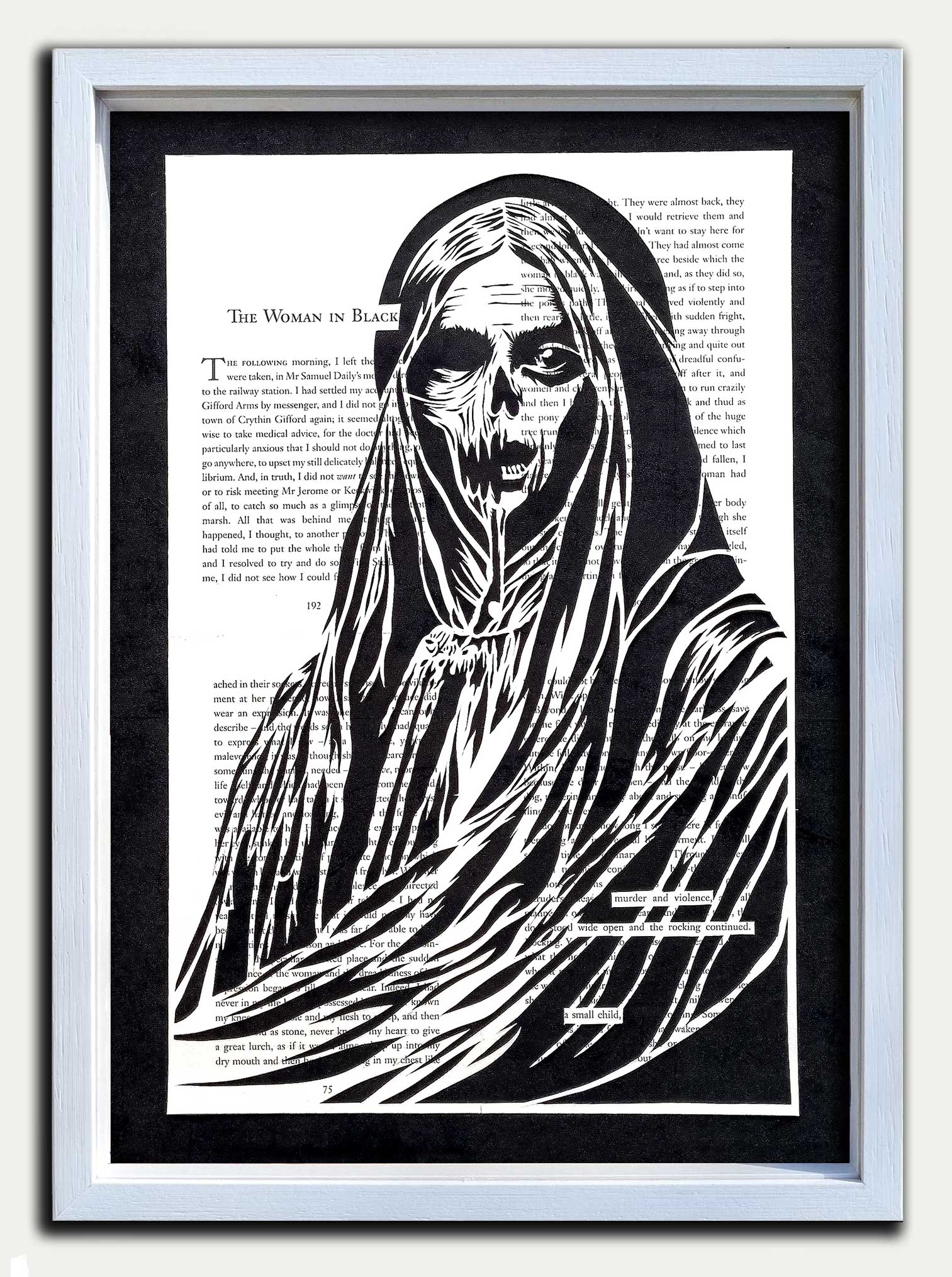 The Woman in Black original, hand cut, artwork. Cut from pages 192, 75, 145, and the penultimate page 199 of Susan Hill's classic horror novel.